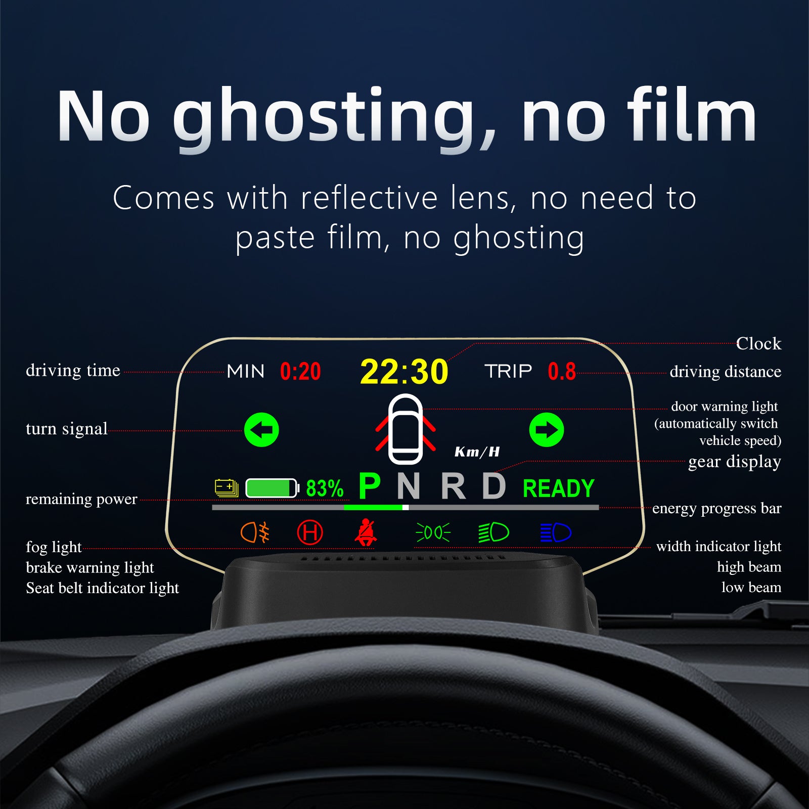 Utilizing self-curved surface technology and a multi-layer optical coating, the floating virtual display effectively corrects image distortion. Images are ghost-free, and the display brightness automatically adjusts according to light intensity, ensuring no glare when driving in various weather conditions.