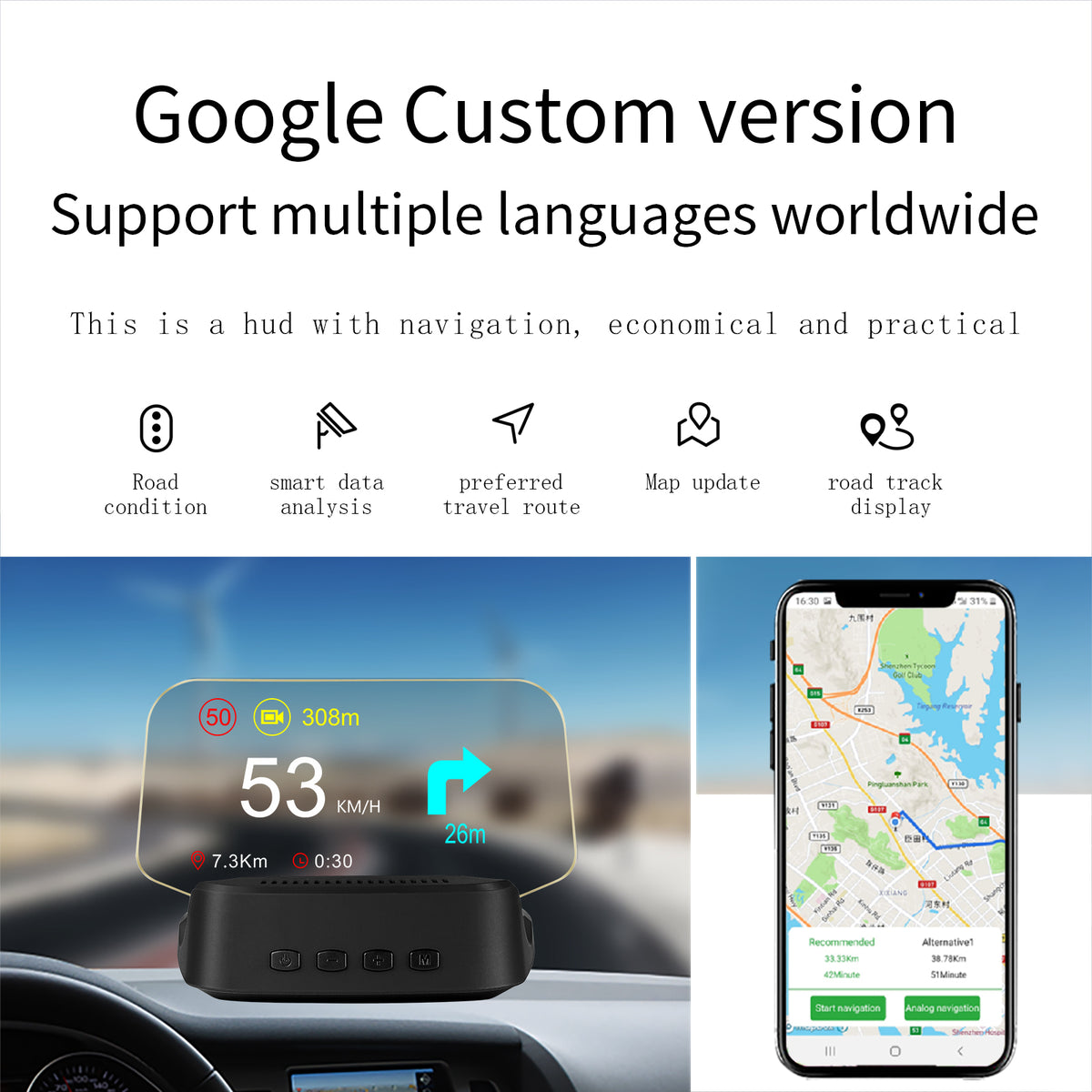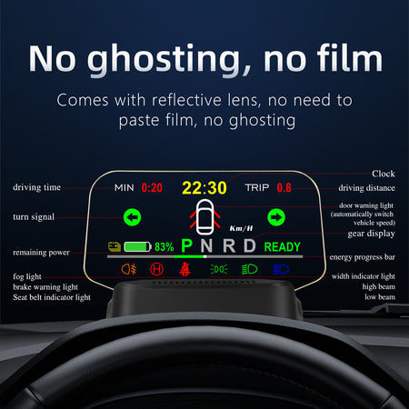 The HUD can connect to a mobile phone via Bluetooth, and navigation information is displayed synchronously through an app. Compatible with both Android and Apple phones.