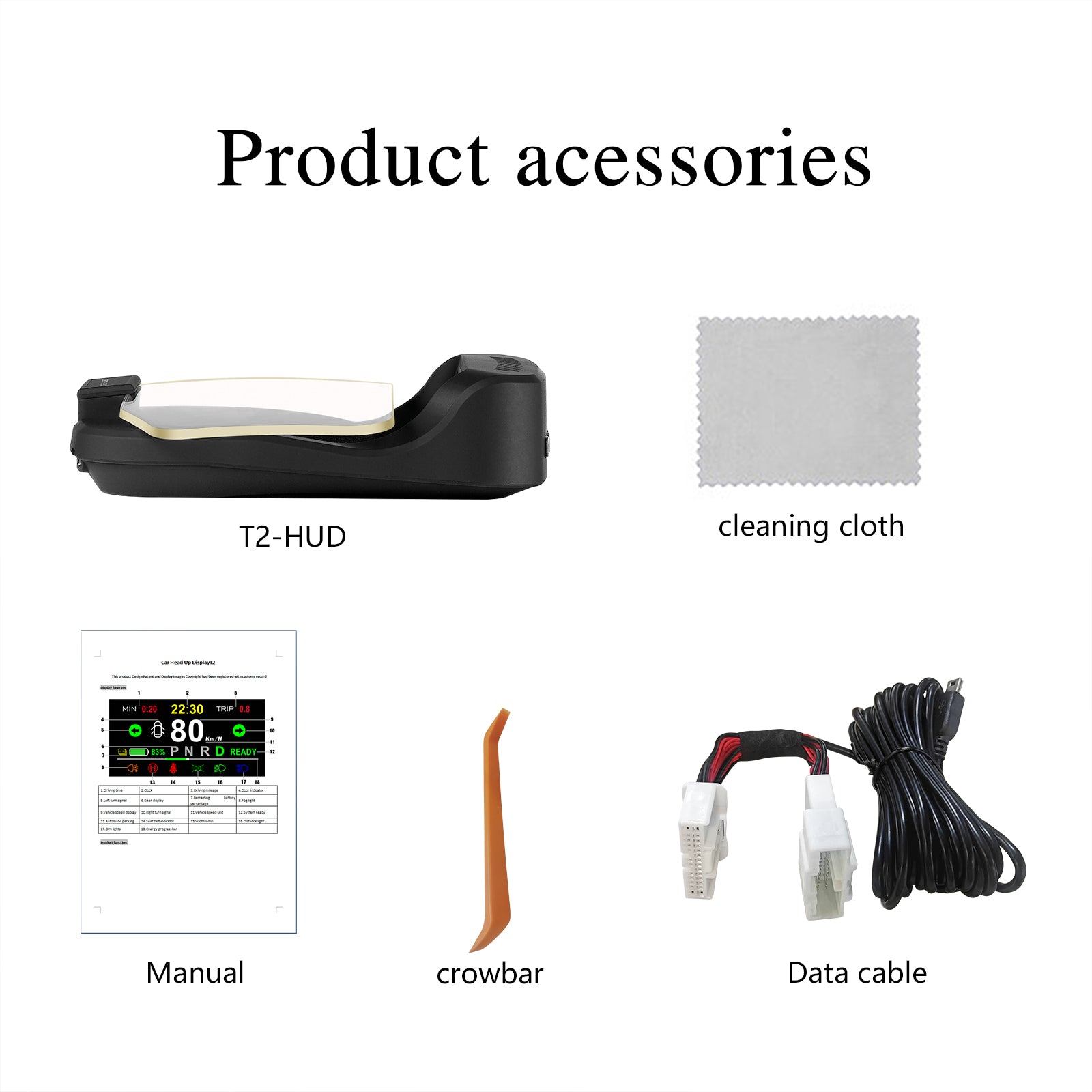- Package list Car HUD *1,Data Cable *1,Pry Tool *1,Anti Slip Pad *1,Cleaning Cloth *1,Manual *1