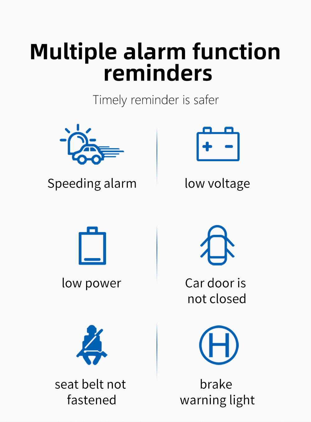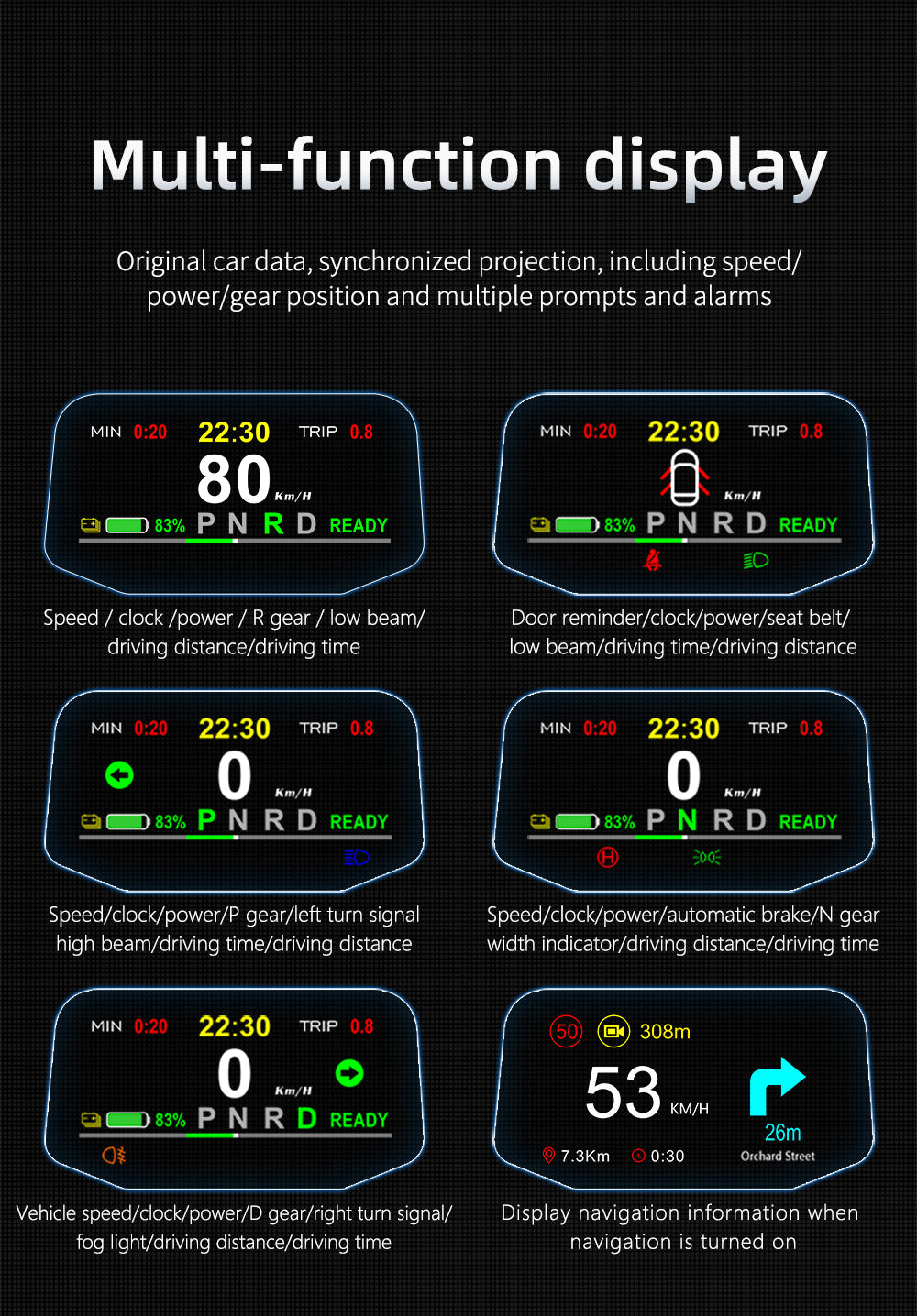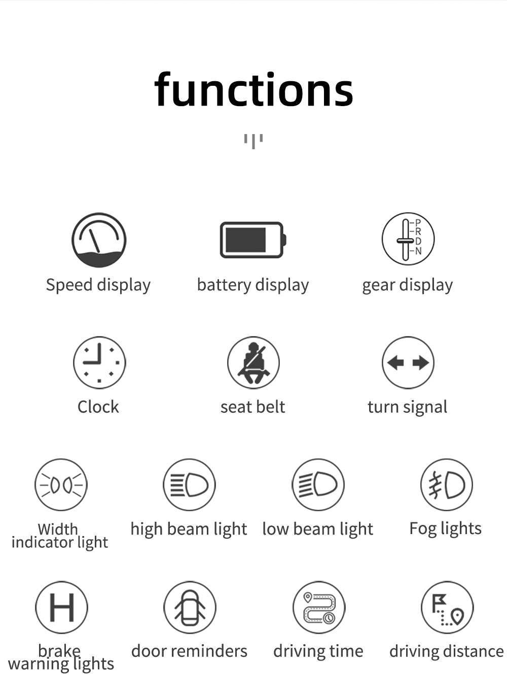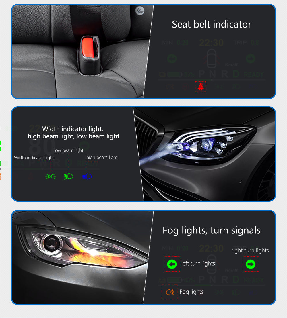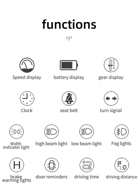 Alarm functions—overspeed alarm, low voltage alarm, low battery alarm, door open alarm, seatbelt unfastened alarm, and brake warning light alarm. Vehicle information—speed, battery level, gear position, digital clock, seatbelt, turn signals, side marker lights, high beam, low beam, fog lights, brake warning light, door reminder.